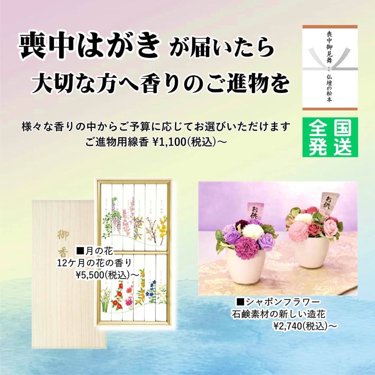 仏壇・仏具・位牌・仏像・寺院用具・神棚・神具・神社用具・提灯などの盆用品・床の間用掛軸・各宗派正式念珠・香・ろうそく・経本・CD・家紋用品の販売、並びに修理。