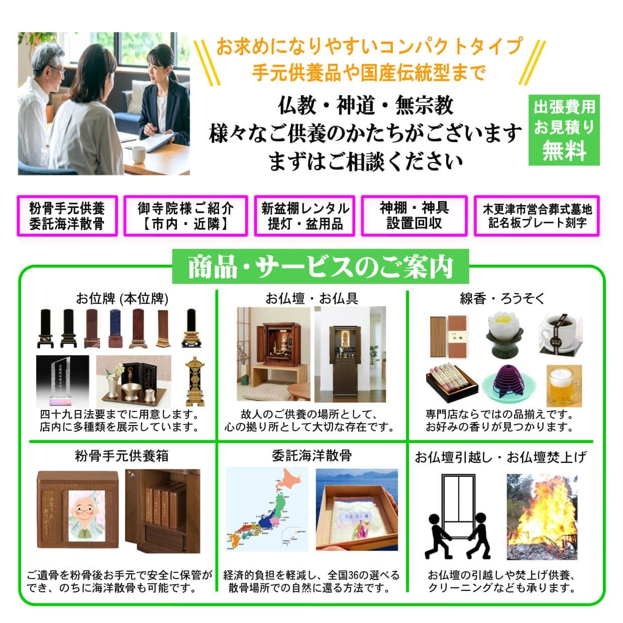 明治38年創業以来百余年。宗教用具専門店として、ご供養のお手伝いをしております。所在地は木更津駅前です。君津、富津、袖ヶ浦などを中心に営業しております。 佛壇は常時40本以上陳列し、メーカー価格から大幅割引しており、カタログからもお選びいただけます。宗派別念珠・仏具・香・神棚・提灯等も取り扱っており、お仏壇の修理・洗浄も承っております。仏事・神事にご不明なことがあれば、お気軽にお問い合わせ下さい。 [取り扱い商品]